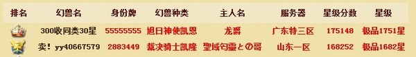 大家看图片,从幻兽的名字来看,第一名的凯恩的主人很明显是绝不放弃,第一宝座一定想保住,还不断收30星凯恩合主属性。而第二名的凯龙却刚好相反,开始叫卖了,就是不知道主人是调唆大家开玩笑的还是真的要卖掉了呢?要是有心想与第一名凯恩一决高低的玩家不防到山东一区看看了哦。