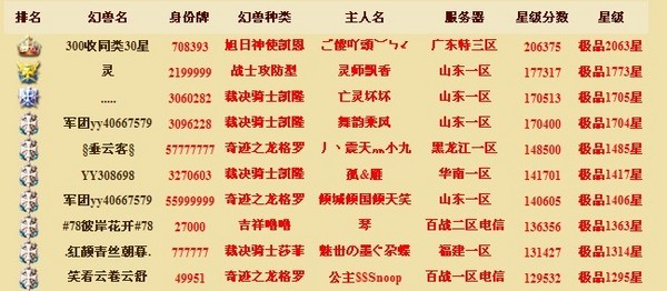 从2010年幻兽突破300*以后,魔域幻兽排行榜不断被刷新,今天小记整理了一下截止2013年5月15日魔域幻兽排行榜的前十名,满足一下大家的好奇心。