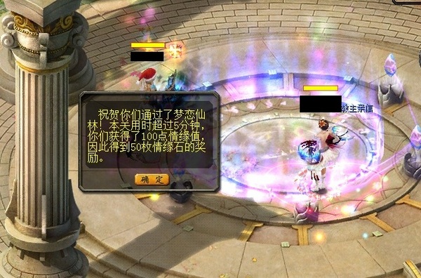 进入第一关“梦恋仙林”,两个人会分开,男号在地图左上角,女号在地图右下角,男号需要杀怪收集“玫瑰未死”四个字,女号需要杀怪收集“此爱犹存”四个字,然后两个号一起走到地图中间的祭坛上,阅读那本“梦恋星经”,记住两个号要一起点阅读才行。根据通关时间,给与不同的奖励。5分钟以上的,100点情缘值,3-5分钟的,150点情缘值,3分钟以内通关的,200点情缘值。