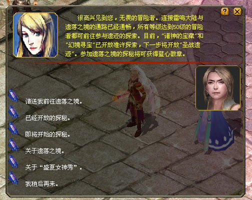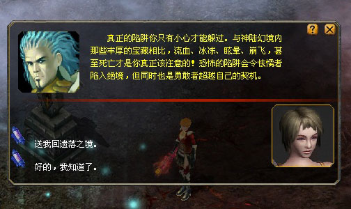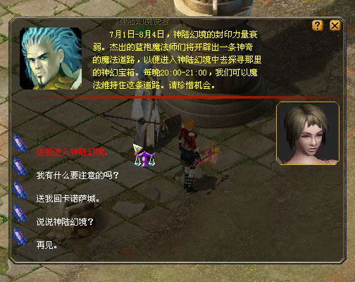 | 1.7月1日-8月4日,找卡诺萨城的女王特使法米尔(304,402)进入遗落之境。 2.与遗落之境的传送使葛林(89,299)交谈,传送至神陆幻境使者桑纳(234,292)身边。 3.每晚20:00-21:00,冒险者经由神陆幻境使者桑纳(234,292)进入神陆幻境去自由冒险。 4.神陆幻境内每5分钟出现一批神幻宝箱,打开宝箱即可获得各种宝物;若冒险者携带了幻境藏宝图,还可在神陆幻境的藏宝点探索以获取额外收获。 5.使用从神幻宝箱中获得的蓝心徽章,可在卡诺萨城的女王尊贵奖励使卡撒琳(309,402)和女王日常奖励使爱莲娜(314,402)处兑换王国奖励。 6.在神陆幻境内须注意躲避陷阱。陷阱可能使冒险者陷入昏迷或混乱状态,更有甚者会将冒险者弹飞,甚至使他们气血降为1。 7.抚摸神陆幻境内的治疗图腾(344,188)可以恢复气血,但每位冒险者每分钟仅可使用1次。 8.与神陆幻境的神陆幻境修士桑丘(344,194)交谈,可以回到遗落之境。 | |