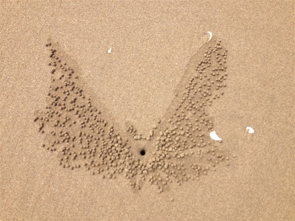 沙滩上,倒是很多发现,尤其是很多小螃蟹挖的坑。挖坑也就罢了,把那些没用的沙子还摆造型,真服了那些螃蟹!