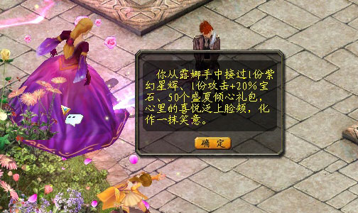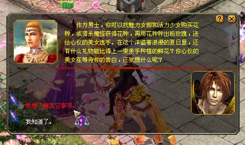如果你是男士,嘿嘿,要做的事可就多了。首先,你要找到魅力女郎布兰和活力少女贝塔,用金币或魔石购买粉玫花种包,然后在她们的指导下,前往大花圃,种出粉玫瑰,送给心仪的女孩。哦,对了,在收获粉玫瑰的同时,你还能获得珍贵的蓝心徽章哦。