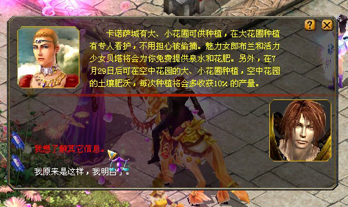 | 任务关键NPC | 名字:盛夏使者•露娜 位置:卡诺萨城(295,524) 作用:活动引导、规则介绍、奖励发放 名字:百花精灵•伊娃 位置:遗落之境的空中花园(812,596) 作用:活动引导、规则介绍 名字:魅力女郎•布兰 位置:卡诺萨城(303,533)及遗落之境的空中花园(808,597) 作用:种植规则介绍、种植道具发放、种子出售、肥料出售 名字:活力少女•贝塔 位置:卡诺萨城(302,528)及遗落之境的空中花园(814,593) 作用:种植规则介绍、种植道具发放、种子出售、肥料出售 |