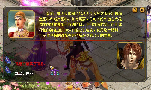 另外,魅力女郎布兰和活力少女贝塔那还出售加速肥料和增产肥料。如有需要,你可以给种植在大花圃中的粉玫瑰施用特殊肥料。使用加速肥料,可令你种植的鲜花加快10分钟的成长速度;使用增产肥料,可令你种植的鲜花在开花后多收获10%的产量。