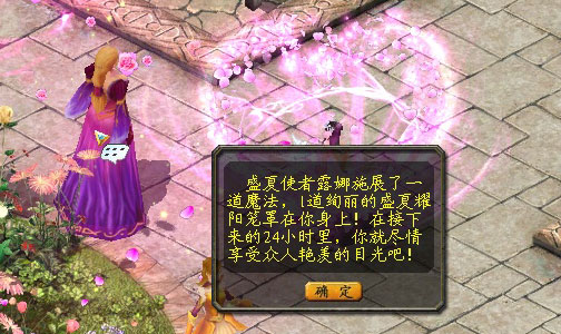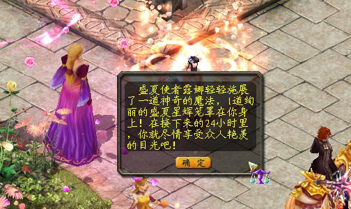 | 1、2013年7月20日-2013年8月4日,找到卡诺萨城的盛夏使者露娜(295,524),了解“盛夏女神秀”的详细情况; 2、男士须找到魅力女郎布兰(303,533)和活力少女贝塔(302,528),用金币或魔石购买粉玫花种包,并在她们的指导下,前往大花圃,种出粉玫瑰,送给心仪的女孩; 3、手头金币与魔石匮乏的男士,可在雷鸣大陆或遗落之境的空中花园剿杀魔怪,获得粉玫花种盒,打开后可获得相应的粉玫花种包(部分粉玫花种盒需要消耗魔石打开),然后在大花圃或小花圃中将花种种下,培育出粉玫瑰,送给心仪的女孩; 4、50、100、300颗的粉玫花种可在宽敞的大花圃种植,且不用担心花朵被别人摘去。5、20颗的粉玫花种就只能种在数量有限的小花圃中,且花朵开放后有可能会被人摘去; 5、7月29日-8月4日,遗落之境的空中花园开放后,你将可在空中花园的魔怪身上找到更多花种盒,还有可能找到花种数量巨大的花种盒;空中花园的土壤肥沃,每次种植将会多收获10%的产量。 6、魅力女郎布兰和活力少女贝塔那还出售加速肥料和增产肥料。使用加速肥料,可令你种植的鲜花加快10分钟的成长速度;使用增产肥料,可令你种植的鲜花在开花后可以多收获10%的产量。 7、女孩们要尽量多地争取男士的青睐,得到尽可能多的粉玫瑰,才能跻身前列,冲击每日的主题花魁排行榜; 8、每晚的20:00-22:00是“盛夏女神秀”的秀场时间,获得粉玫瑰总数排行居前10的女孩可前往盛夏使者露娜处,领取代言大喇叭为自己拉票。她将为你施展美妙的魔法,让你的体型暂时变大,并身着炫目的光环,争取更多玫瑰; 9、截止晚上的22:00,获得粉玫瑰总数位居前10的女孩即是当天的盛夏女神,她们可以从盛夏使者露娜手上获得当日主题的盛夏女神大奖; 10、截止晚上的22:00,每天送出粉玫瑰数量排行前10的男士将荣登当日送花排行榜,获惜花者大奖; 11、收到过粉玫瑰却未能跻身前10的女孩,可向盛夏使者露娜领取盛夏清新小赠礼,即1份神祝幻尘。 12、活动期间美女们收到的粉玫瑰与男士们送出的粉玫瑰总数,将在8月4日由主办方分别统计在花魁总榜和送花总榜上。届时跻身花魁总榜或送花总榜前10的人将获豪华大奖! 13、荣登当日花魁排行榜或当日送花排行榜前10的美女或男士可额外获得1份夏日梦幻之星。8月4日22:00-8月11日23:59,使用10份夏日梦幻之星可找盛夏使者露娜兑换1件紫幻星辉[赠];女士使用20份夏日梦幻之星可找盛夏使者兑换1份盛夏幻梦项链。 | |