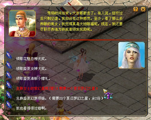 此外,荣登当日花魁排行榜或当日送花排行榜前10的美女或男士可额外获得1份夏日梦幻之星。8月4日22:00-8月11日23:59,使用10份夏日梦幻之星可找盛夏使者露娜兑换1件紫幻星辉[赠];女士使用20份夏日梦幻之星可找盛夏使者露娜兑换1份盛夏幻梦项链。