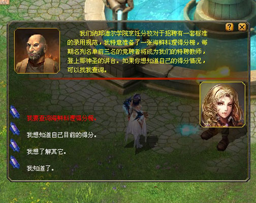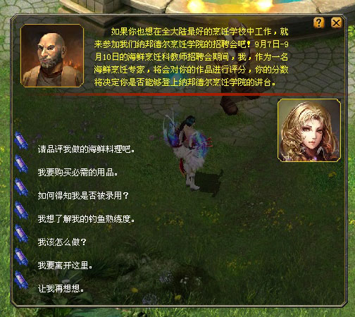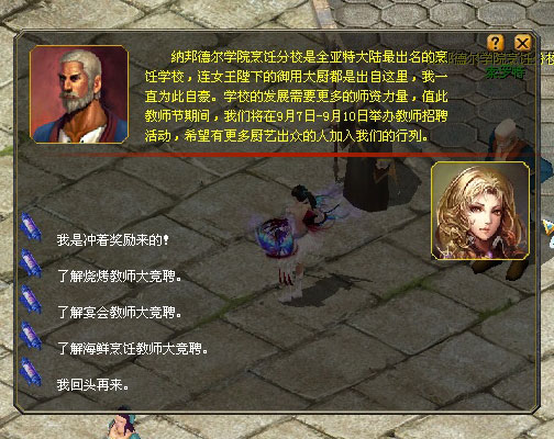 | 任务关键NPC | 纳邦德尔学院烹饪分校校长•索罗特 位置:卡诺萨城(309,403) 作用:了解教师竞聘活动、传送、奖励兑换。 名字:海鲜科主任•鲍比 作用:了解活动详情、任务引导、查询成绩、领取奖励、传送回城。 位置:学院渔港(133,119) 名字:万能烹调锅 作用:制作海鲜料理。 位置:学院渔港(119,124) |