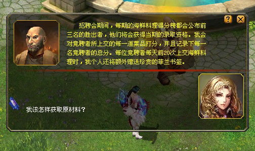 对料理颇有心得的你也来到了卡诺萨城,找到了正在城中介绍本次招聘会的纳邦德尔学院烹饪分校校长索罗特。
