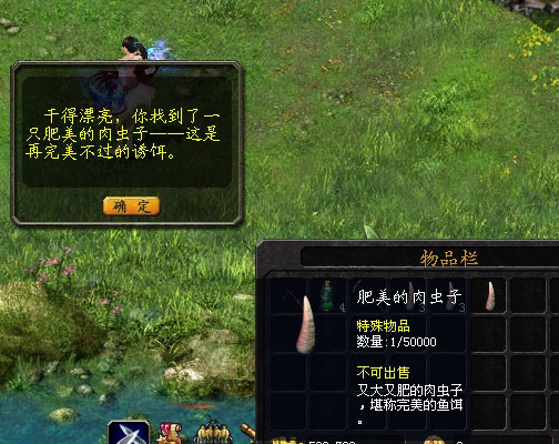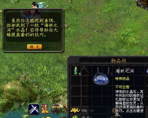 有这只又肥又大的肉虫子做鱼饵,一定能让你钓到不错的海鲜。带着几分雀跃,你更加认真地在附近继续挖鱼饵。突然,你感觉自己挖到了一块坚硬的石头,本来想顺手扫到一边,但是石头发出蓝光让你顿住了动作,拾起一看,竟然是海妖之泪——传说中可以飞快提升钓鱼熟练度的神奇水晶石!
