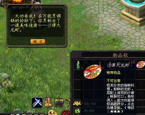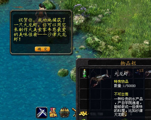经过耐心的等待,哈,你居然钓上了一只大龙虾!这可是一种珍贵的水产品,能够做成一些美味的料理,比如沙律大龙虾!海鲜科主任鲍比一定会喜欢的!与此同时,你的钓鱼熟练度也提升了。随着钓鱼熟练度提升到更高等级,你将有更高的几率捕获档次较高的海鲜。