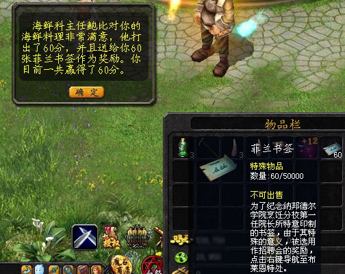 | 任务关键道具 | ![]() 鱼竿 说明:这根鱼竿用学院渔港出产的硬木制成,有着绝佳的韧度。点击右键使用。 ![]() 铁镐 说明:一把普通的铁镐,可以用来挖掘肉虫子,点击右键使用。 ![]() 海鲜调味料 说明:一份特制的海鲜调味料,能够用来烹制各种风味的海鲜美食,可以在海鲜科主任鲍比处购买。 |