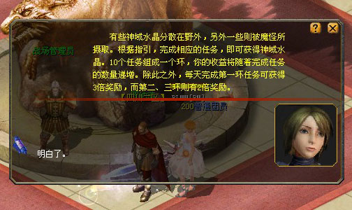 | 1、9月24日起,卡诺萨城的神域幻境传送使卡缪(315,419)将帮助冒险者进入神域幻境。 2、到达神域幻境后,找到幻31—泛想锻城(幻)的神域远征军指挥官罗纳德(188,187),他将指导你前往各大城市收集神域水晶。 3、这种蕴藏强大能量的神秘晶体分散在神域幻境的各个角落,你可以通过击败各个城市的魔怪获得或者前往野外收集。 4、当你完成1个任务后,你将获得指引继续完成下1个任务。每完成1个任务,均能获得大量神域水晶。 5、10个任务组成一个环,你的收益将随着完成任务的数量递增。当你完成1环任务后,需找到罗纳德以接受新的作战任务。 6、除此之外,每天完成第一环任务可获得3倍奖励,而第二、三环则有2倍奖励。每天可完成10环任务。 | |