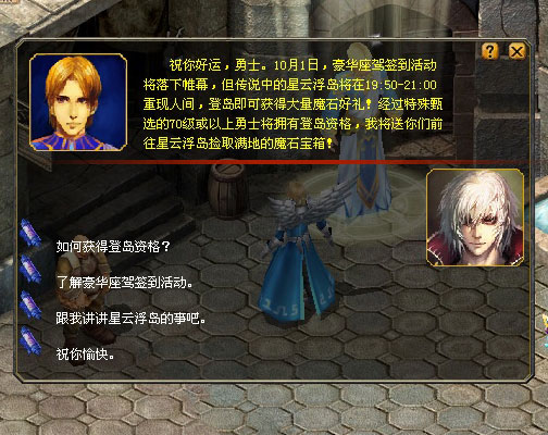 原来,星云浮岛不仅仅是一个梦幻般的传说。那个凡人不可涉足的浮岛会在神谕中所指示的时间里降临到亚特大陆。10月1日的19:50-21:00,你将有机会踏足这处圣迹。