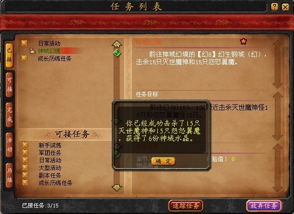 然后,杀完怪之后,会跳出一个对话框,告诉你得了几个神域水晶。然后,直接开始第二个小任务,这个时候你不需要找NPC,你的任务面板上就有显示是哪个任务了。