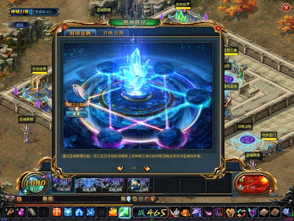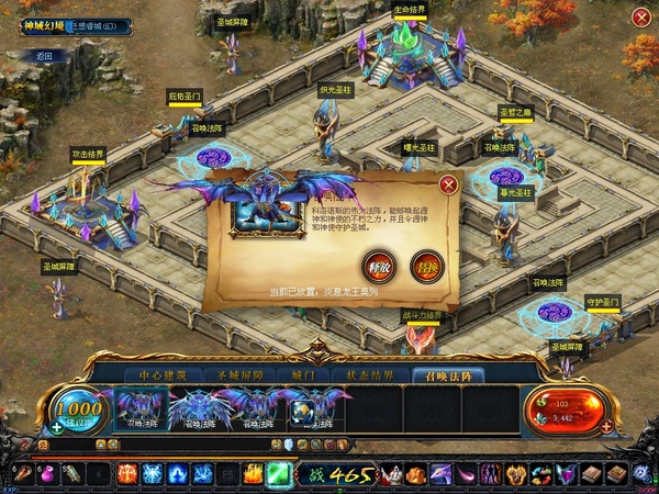 先升级城池到一定建设度,然后开启四个召唤法阵。从而将军团捕捉到的源神放置在召唤法阵之中。源神的捕捉方式之前已经有文章介绍,所以我就不去再废话了。