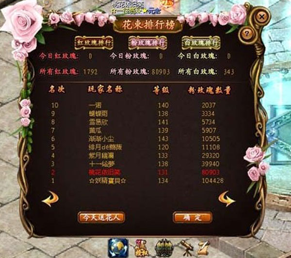 能有2个号进入花榜,我也欣慰了,在这里感谢魔域中曾经给我刷过一些花花的朋友:龙族皇太子、峃爼の神乀、血☆魔、易三国、死神乄媳妇、13430837028等等。