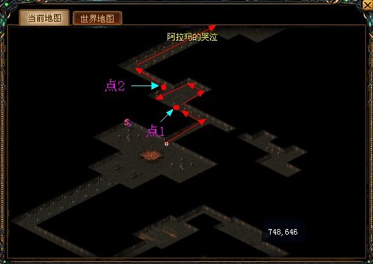 第三关:开好门,沿着红色路线往前跑,跑到点1处交易下小号(如图),接着大号关掉4个封印机关(速度要快),跑到点2的时候小号正好到了点1,这个时候再交易下小号,小号就过来了