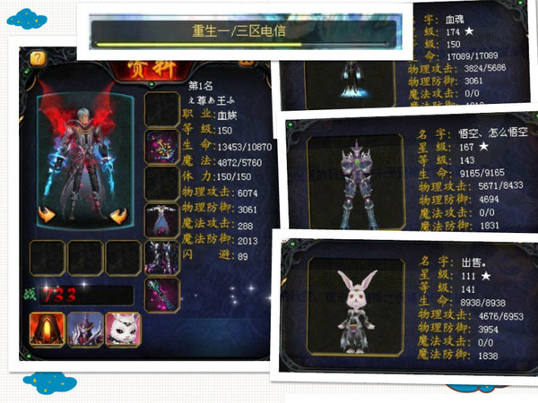 图片上的人物是怀旧3大区,经历过N次并服后的重生1区的老大,名人堂显示的战斗力是733站,大家可以看见我截图的时候他还有2件装备没穿上,174星的血魂,战士攻防167星,这是魔域史上最古老的一种幻兽,属于比较难合的一种宝宝,在怀旧不能和太古,不成神,宝宝应是吃副一点点的砸出来的,167星攻防花费的心血和精力可想而知。111星的兔子。