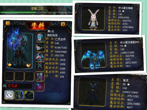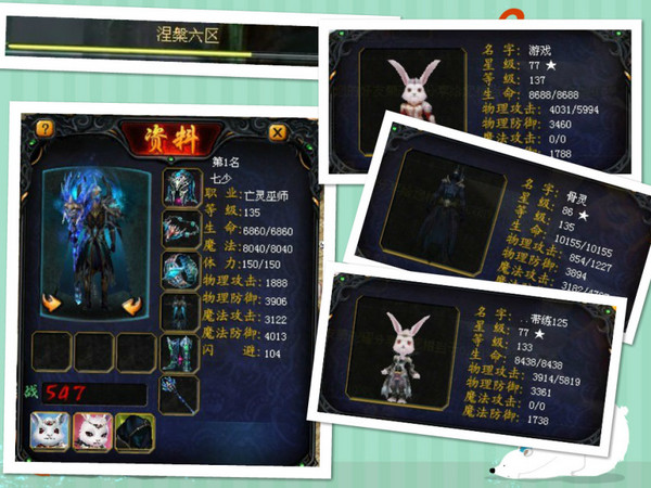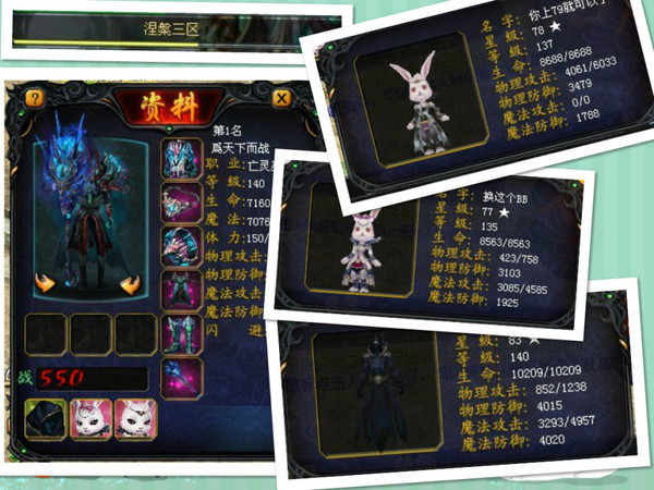 图片上的人物是怀旧3大区,涅槃3区的的名人堂老大,名人堂显示的战斗力是550站,人物等级是140级,看看多霸气的名字,一看这名字就知道是老大,一只77星的兔子,一只78星的兔子,骨灵83星,他所搭配的宝宝也是属于易冲星的。