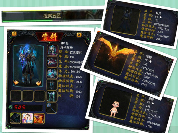 图片上的人物是怀旧3大区,涅槃5区的名人堂老大,名人堂显示的战斗力是545站,他的人物等级是137级,一个乖儿子75星,好漂亮的凤凰77星,骨灵84星。