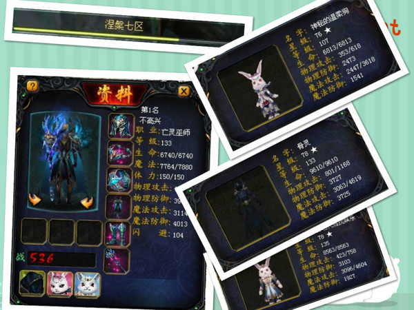 图片上的人物是怀旧3大区,涅槃7区的名人堂老大,名人堂显示的战斗力是536站,人物等级133级,一只76星的兔子,一只78星的兔子,骨灵78星