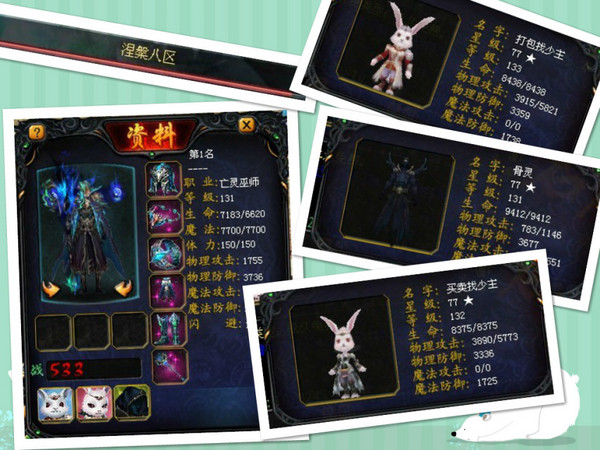 图片上的人物是怀旧3大区,涅槃8区的名人堂老大,名人堂显示的战斗力是533站,人物等级是131级,涅槃8区开服的时间不是太长,能冲到533站已经很了不起了,骨灵77星,2只兔子都是77星。