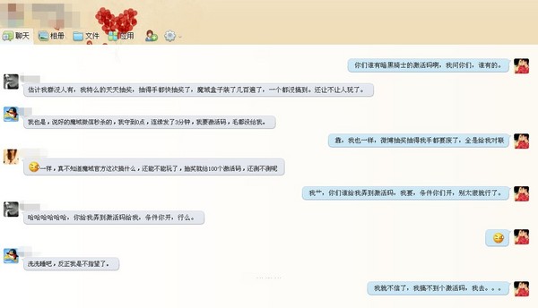 因为最喜欢玩魔域,所以小记,加了一些魔域QQ群,下面是小记在QQ群里求码的聊天记录,有图有真相。
