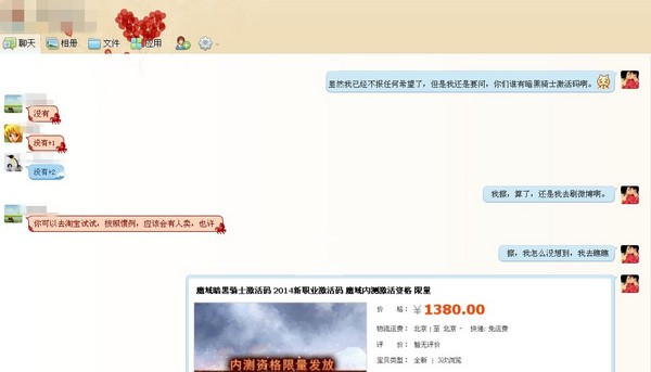 这个群,同样没有一个人有,但是有人建议去万能的淘宝看,当时小记好像看到了希望,信心慢慢的去淘宝搜,结果失望而归了,1380元的价格,不是我们这些俗人能承担的起的。要是1380魔石,小记就果断下手了。