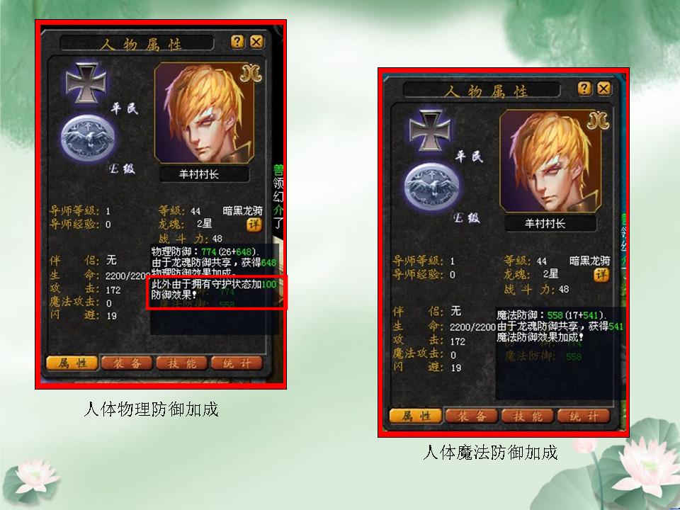 大家看看以上两个图,从小记的实际效果,魔龙守护是作用与人物的物理防御,而魔法防御是暂时看不到有加成的!