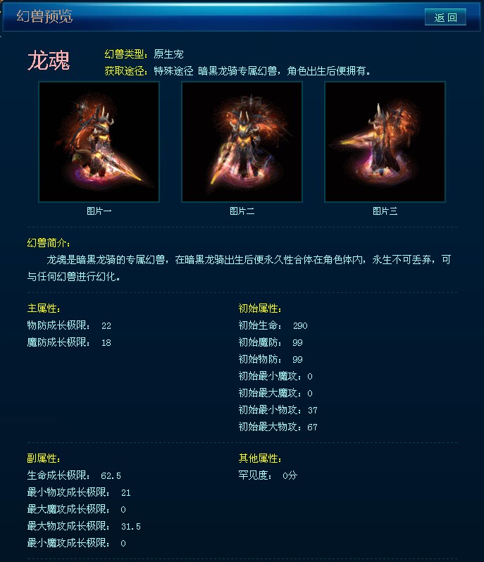 龙骑的本体宠是属于双防属性的。物防成长、魔防成长两项主属性.遗憾的是防御变态的高,物理攻击逊色于血族, 副属性最大物攻成长极限为31.5,也就是说当人物等级达到133级时,其最大物理攻击极限是(133-1)*31.5+67=4225,人物等级达到150级时,其最大物理攻击极限是(150-1)*31.5+67=4760.