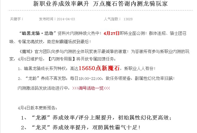 正值魔域第6职业资料片“暗黑龙骑·浩劫”火热内测中,魔域活动持续不断,从刚刚过去几乎人人都能拿到奖品的愚人节任务,到即将来临的清明节任务几乎都把玩家的需求放在了第一位,这不,在此次“暗黑龙骑·浩劫”内测过程中,魔域广纳贤言,对玩家不满的地方进行了修改,而且为了让参加内测的玩家更好的体验暗黑龙骑,官方特别追加了一个免费赠魔石的活动,每个暗黑骑士所获赠的魔石多达1.5万,如此大的手笔,在魔域史上是绝无仅有的,而这个活动紧紧是针对内测服暗黑骑士玩家的,其余服务器和非暗黑龙骑的玩家则无缘此活动了。