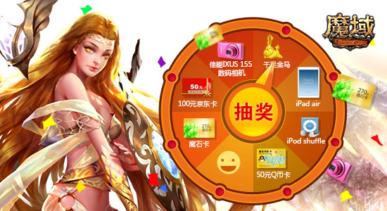 不仅如此,送大奖从来不含糊的《魔域》官方还特别设立了女神约会启动资金:超过10万元现金的京东卡、Q币卡、以及魔石卡倾囊相送。下载游戏、领取特权礼包还可以获得抽取iPad Air、千足金马、佳能相机、iPod Shuffle的机会,无限量红钻供应,向四大女神表白,赢取美人心意的千载良机就在眼前,不可错过!