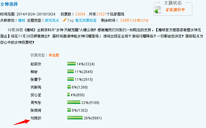 历经八年战火硝烟的洗礼,魔域和千万魔民成就了史无前例的荣耀,在11月29日的巅峰盛典中将邀请投票最高人气具有“美人邦”斑竹、柔然公主之称的女神刘雨欣将现身魔幻趴现场,这可是官方继“女神·天赋觉醒”资料片公测之后倾力打造的一场回馈答谢活动,也是千万魔民与我心目中的女神面对面互动的一场巅峰盛事哦。而且不光有女神,而且还安排了100名女仆,一对一服务到场的光大魔民玩家。应该还会有些珍贵勋章等礼品。是不是很给力,我现在热情澎湃了。。以下就是光大朋友们投票推选的结果,如图:
